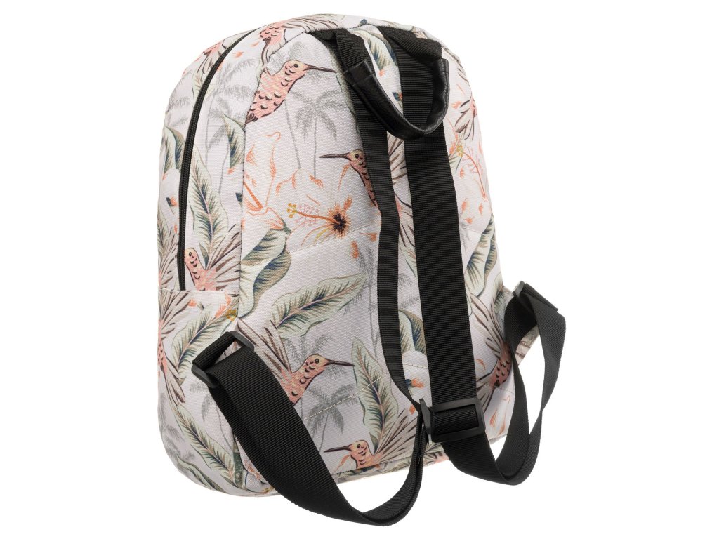 Klasický dámský batoh nabízí dostatek prostoru pro všechny vaše osobní věci a navíc skvělý komfort při nošení. Vyrobeno z tkaniny nejvyšší kvality. Batoh zdobí letní barevný vzor. Vnitřek je podšitý látkou. Tento model je jednokomorový se 2 kapsami uvnitř. Jedna z kapes je na zip, druhá je otevřená. I přes své malé rozměry se do ní snadno vejde peněženka, telefon, klíče nebo několik základních kosmetických přípravků.
