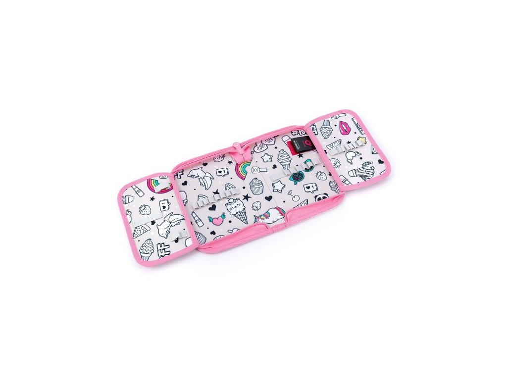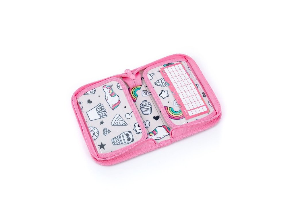 Jednopatrové školní pouzdro se dvěma klopami je ideálním pomocníkem pro každého malého školáka. Díky praktickým gumovým úchytům se do pouzdra vejde celkem dvacet jedna pastelek, tužek a fixek, což zajišťuje dostatek místa pro všechny psací potřeby. Tři širší úchyty jsou navrženy pro uložení pravítka, kružítka nebo nůžek, zatímco dva větší úchyty pohodlně pojmou gumu a ořezávátko. Pohodlí a ochranu zajišťuje polstrovaný design pouzdra, který chrání veškeré psací potřeby před poškozením. Zapínání je řešeno kvalitními zipy s velkými taháčky, což usnadňuje manipulaci dětem. Pod klopou z průhledné fólie najdou žáci rozvrh hodin, zatímco druhá klopa může sloužit například na taháky. Vnitřní podšívka pouzdra je vyrobena z šedé látky s natištěnými obrázky, které si děti mohou vybarvit podle své nálady a chuti. Na závěr doporučujeme, aby k vybarvování používaly pastelky, protože fixy by se mohly rozpíjet. Toto pouzdro je tak nejen praktické, ale také kreativní, a stane se skvělým společníkem na cestě za vzděláním!