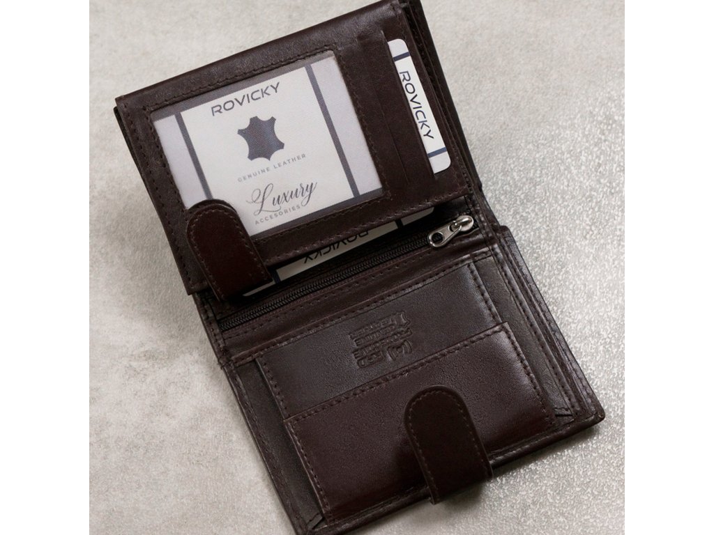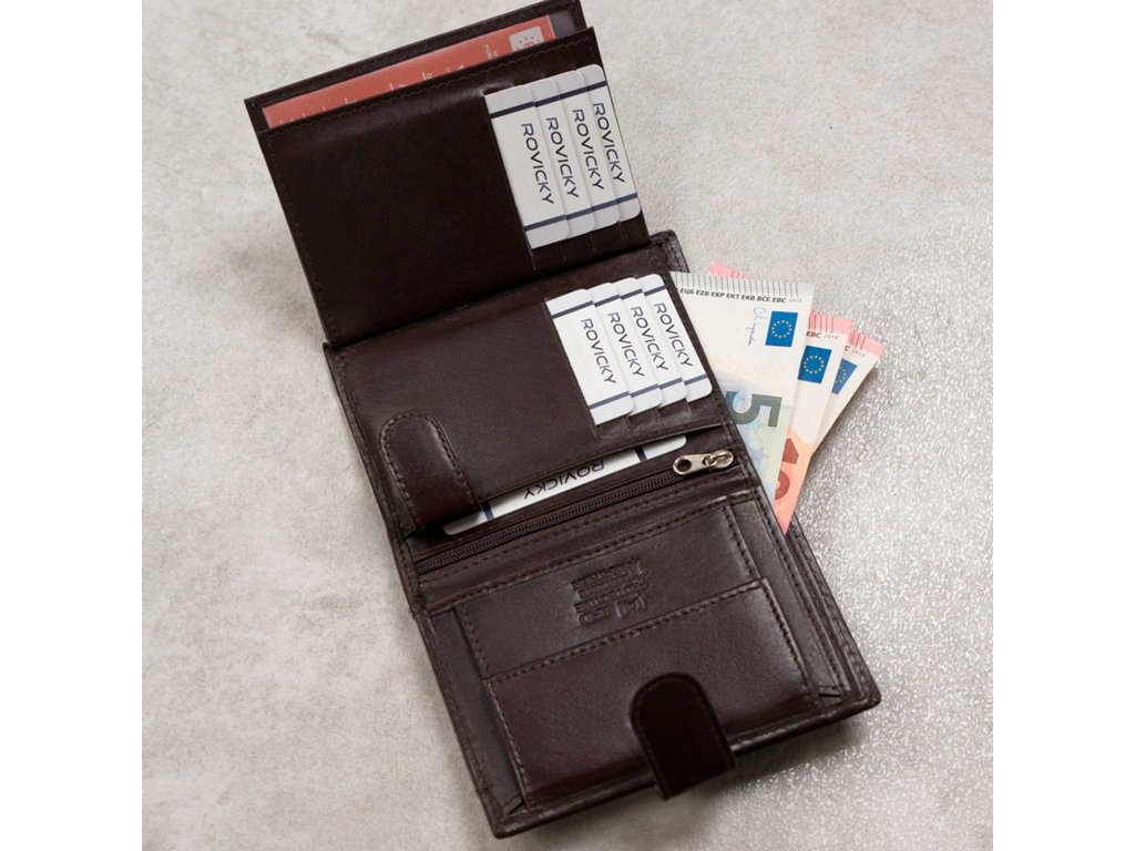 Pánská peněženka je vyrobena z kvalitní přírodní kůže s mírně lesklým povrchem, což jí dodává elegantní a sofistikovaný vzhled. Navržena je na výšku, což usnadňuje uspořádání a přehlednost. Vnější zapínání je řešeno páskem s drukem, který pevně drží peněženku zavřenou. Peněženka je vybavena RFID technologií, která chrání vaše platební karty před neautorizovaným skenováním. Uvnitř najdete dostatečný počet přihrádek na platební karty a vizitky, což umožňuje snadné a přehledné uspořádání. Dále jsou zde přihrádky na bankovky, kapsa na mince uzavíratelná na druk, a průhledné kapsy vhodné například na fotografii nebo větší doklady. Pro bezpečné uložení drobností je součástí také kapsa na zip, která udrží vaše věci v naprostém bezpečí.